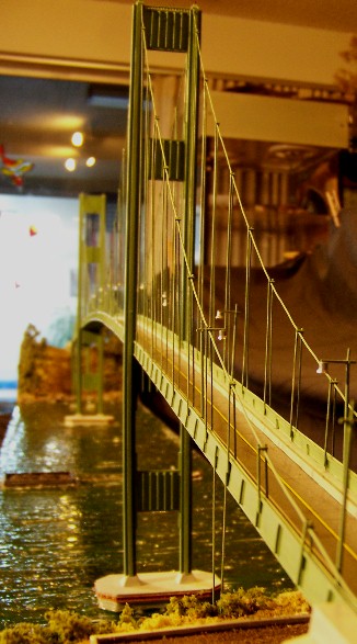 I would have liked to been able to model the entire anchorage structures on both ends, the Gig Harbor anchorage is longer than seen here, and the Tacoma anchorage included the toll booth facility and 2 utility buildings with stairways leading down to the road & parking lots, as well as approach lettering as one came up towards the toll booths that said "Tacoma Narrows Bridge" "Gateway to Olympics". I was limited in space, this diorama being 7 feet long by about 2 feet tall, if I were to make it with the exact scale length of the bridge crossing 1 mile distance, and include both anchorages & the toll booths with the roadway, it would have had to be over 22 feet long. I would have to build a separate building in order to make another model in the true length. It was hard enough to move the diorama from upstairs where it was built, to downstairs where it is housed in the Narrows Bridge "museum".