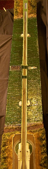 The original east anchorage structure was designed in the late 1930's with art deco lines, this recreation was done completely with flat stock, measured, cut and assembled to the same dimensions & deco lines as the original. This was time-consuming, but the result looks great, and the parking lot with roadways that the anchorage sits on was actually copied directly from the original blueprint, reduced on a copy machine until it matched the scale. This made it easier to do the landscaping and get the footprint the building has. The railroad tracks were also all scratch-built, individual ties glued one by one to the rails, then painted a rusty brown color to match the look of the real tracks. The telephone poles have 6 wires similar to the original, that is before the real ones were taken down with the advent of underground & cable tv communication lines.