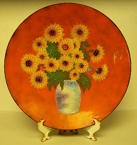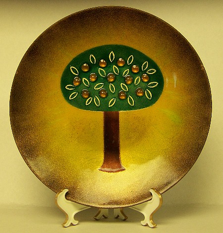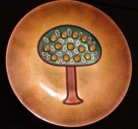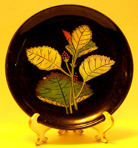 Value : $15 - $18 This plate is 7" with a gloss black color field and simple leaves & small berries in the center. The rear side is unglazed and unmarked. This plate is an unusual composition than Alexander's typical work. The copper is much heavier, a thicker gauge metal with a rolled edge. It is believed that it originally had a paper label.