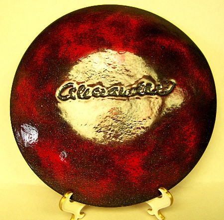 Value : $30 - $35 The tree plate above is courtesy of Andrea in Yorktown Heights, New York. The plate is another version of the first shown on this page; it is 9" with a copper color mottled field and a tree made with high relief fruits in the middle; a twist being the tree on this plate features a high relief border. Alexander was known for making the same basic pattern with subtle variations so that his work did not look as if it all came off an assembly line. The rear side is untitled with an unusual hand-painted gold lettering "Hand Crafted in California by Alexander" mark. Again, the unusual size and variation of the manufacturer mark makes this a very desirable item. Thank you Andrea for the contribution !