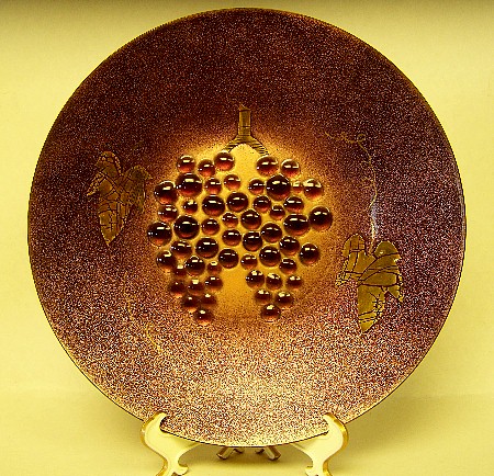 Value : $35 - $40 This plate is 10" with a purple color field and a twin or double set of grapes in high relief, within gold color leaves & below a gold stem. The rear side is untitled with an incised Alexander mark into the gold color glaze. The large size and quantity of high-relief on the plate, as well as the deep purple color makes it a prized item.
