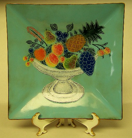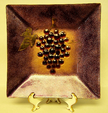 Value : $25 - $30 This plate is 8" square with a purple color field and a single bunch of grapes & gold color leaf and stem in the center. The rear side is titled Grapes by Alexander in gold color hand painted lettering. The plate is the square version of the 10" plate shown above. Again, the high relief grapes, the unusual shape, and attractive purple color gives it a good market value.