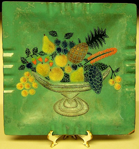 Value : $35 - $40 This plate is 8" square with an aqua blue color field and a cornucopia bowl of fruits including a pineapple, pear, orange, grapes, nectarines, cherries, and blueberries. The rear side is untitled with an incised mark Alexander into the glaze & a foil label marked Made in California by Alexander. The design shown in this and the next two items is typical of the mid-century look so popular across America. The square plate is hard to find than the round plates in this pattern.