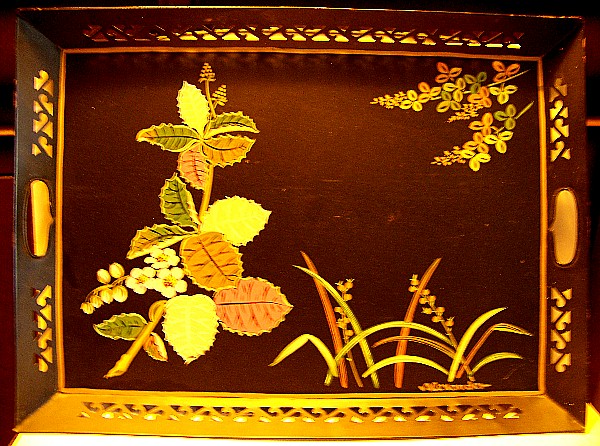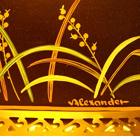 Value : $55 - $75 This serving tray is the largest item Alexander created at 24 3/4" wide by 12 1/2" tall. The tray is not his typical copper base, but rather is sheet metal with pattern-stamped & rolled edges, painted a matt black color on all sides. The design is simple leaf and flower on stems onto the field, with the rear side being untitled. The front lower corner is marked by hand painting Alexander, and the rear side has a paper label marked Hand Painted in California. This tray is one of the plainer creations of the trays he made, but it is still hard to find on the market and attractive because of the size & being a tray. It is believed that Alexander may have purchased blank trays from a manufacturer, and then applied his art to them. They are circa late 1950's.