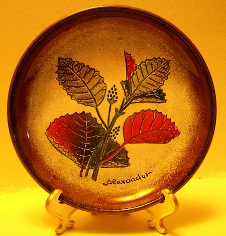 Value : $18 - $22 This plate is 7" with a white fading to bronze color field and the same leaf on the stem & berry design as the prior plate. The rear side is untitled and unmarked, but the front is marked Alexander in hand-painting below the design. This plate is also the heavier copper body as the prior plate, with a slight variation in the design colors; making it a little higher value than the prior plate.