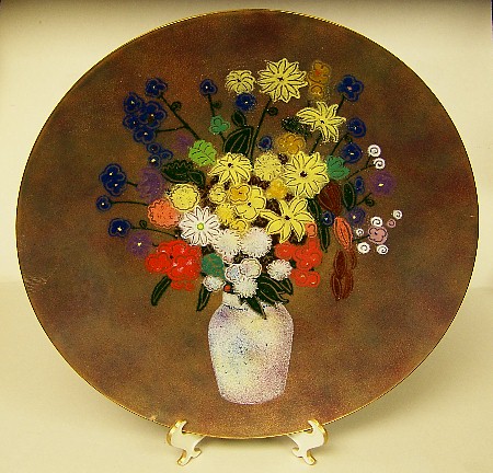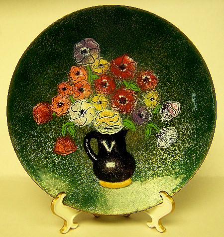 Value : $55 - $60 This plate is the largest size made; 12" with a gold varigated color field and a bouquet of assorted types of flowers in the center. The rear side is untitled, but it has an incised into the glaze mark Alexander along with a foil label marked Made in California by Alexander. This being another design that features many colorful flowers in a vase, but no high-relief elements keeps it from being a higher value; however the very attractive look & large size makes it a better market price.
