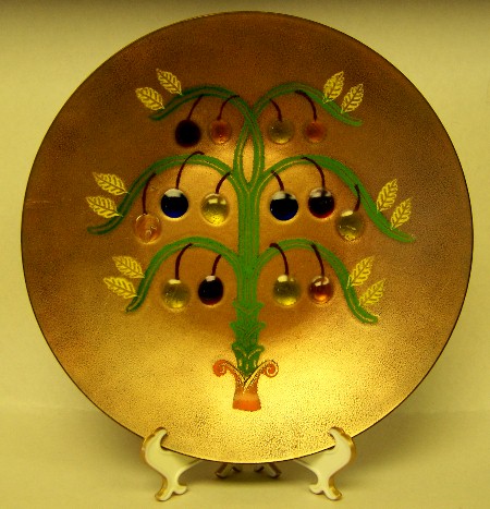 Value : $30 - $35 This plate is 10" with a gold color field and a stylized tree of leaves & hanging fruit made in high relief. The 8" size has the same tree, but it has a purple color field. The rear side of this plate is untitled and it has a paper label marked Made in California by Alexander. The multi-color fruits in high-relief were a signature element in many of Alexander's plates.