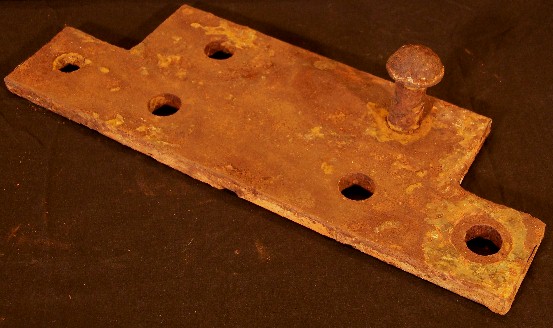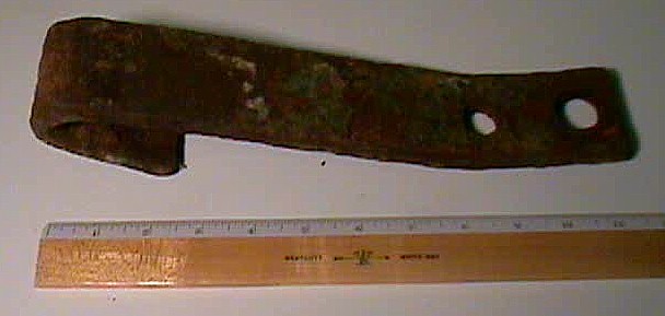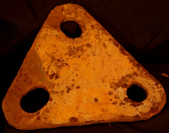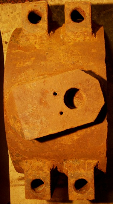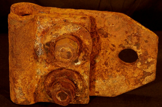 The part shown below is from a tool or equipment. It appears to be a "knuckle" that would have been attached by the holes on the sides. It was a manufactured part, as the maker's logo is still evident on the top surface, however it is too deteriorated to tell what it says.