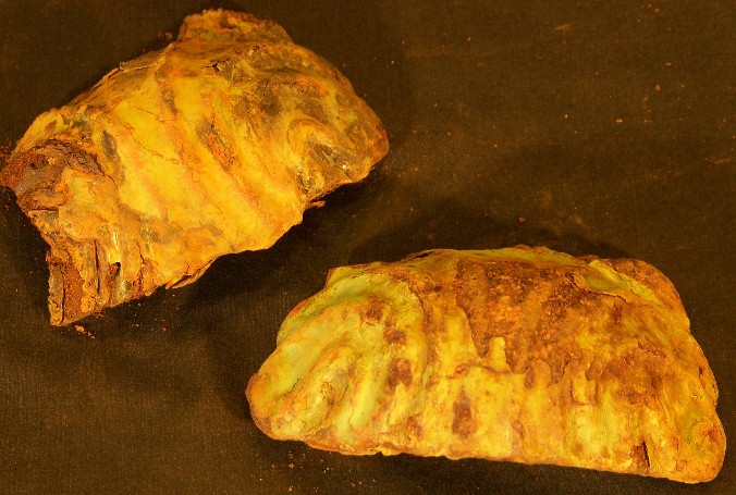 These are mystery parts shown in the photo below, not sure what they were part of, though they were definately from the bridge as they have they orange primer & Narrows Green color paint. They have a 1920's era look with scalloped grooves, similar to fancy feet on a depression era bed frame. A possibility is they are parts of the lamp shades from the bridge lighting, though it is hard to tell from the known photos of the lamps on the 1940 bridge, and the blueprints don't show the specifics. Only the light posts are on the blueprints, the lamps' housing & fixture shades were contracted out, and as such they would be up to that contractor to select what type they were. Nothing else in the original plans appears in this shape or form. An original light post was saved & erected in a Gig Harbor park, but it has a replacement lamp & housing- not an original.