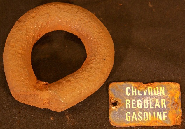 Here is an anchor block relic, cut off at the shank, and an interesting Chevron gasoline metal tag. Perhaps the tag was on some machine that was in the construction or demolition? Not shown, but also found near this tag was a very old battery case, and a few spark plugs.