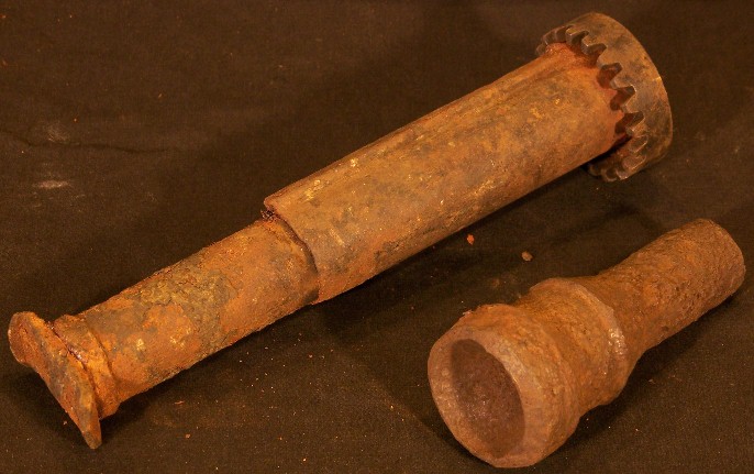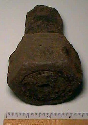 This is one of those "unidentified" objects recovered from deep in the shore under the 1940/1950 bridge. Earl White, an ironworker who examined this, shared his observations. He noted that the hexagonal end was welded onto a cylindrical pipe, that the pipe had a cut out section in the middle, and that the cone shaped end had also been cut & bent inward to form the shape. He did not, however, have any idea what the intended use was.