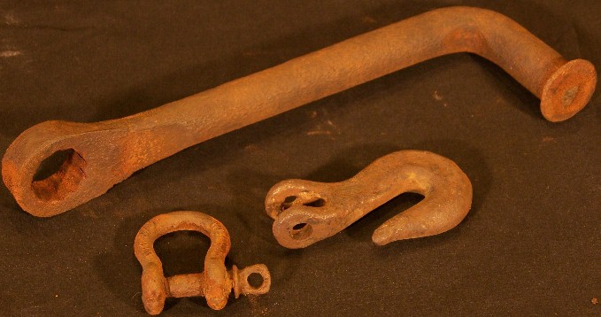 Assorted tools are seen below, the long one being a wrench that went over a band ratchet, the ratchet was found with this handle, but it was severely deteriorated. Next is a hook that took a pin or small bolt to lock it in place on a lifting cable. The small tool is a loop hook with it's own screw-in bolt.