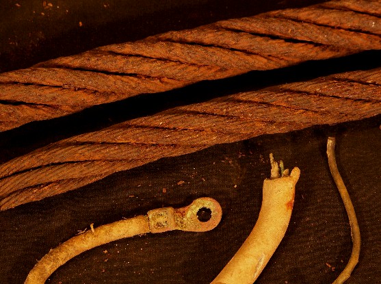 Here are various cables, the top 2 are more than likely lifting cables, then a ground wire with it's lug end still intact, a coated cable of thick-gauge wire, perhaps for electrical service on the bridge, and the smallest wire is a ground wire.