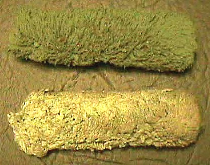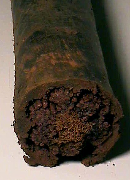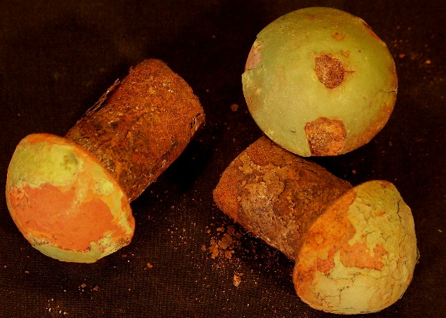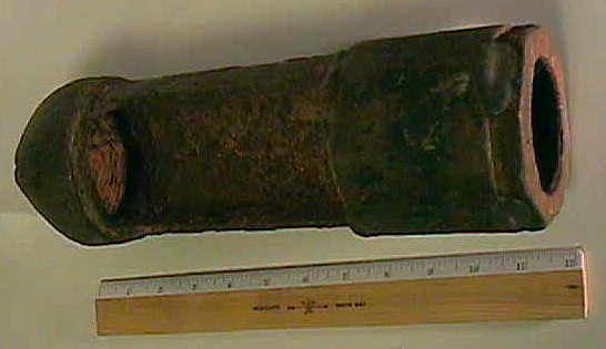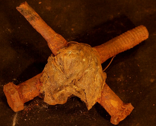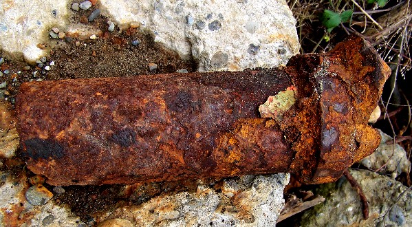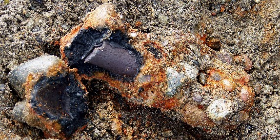 When metals are exposed to salt water they corrode, and usually develop build-up residue which is sometimes called "conglomerate". This material is not organic, and can get quite thick. Nearly all the relics shown in this section were found in this condition, and upon initial discovery, were unrecognizable. The first photo is of a metal bar, not yet pulled out of the ground, but with the top portion of conglomerate removed to show what's inside.