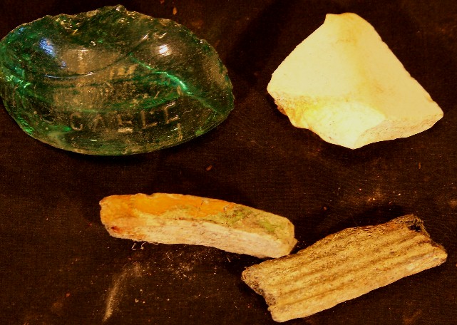 An interesting assortment- part of a broken glass insulator which remarkably is embossed with the word "Cable". Yes, the bridge not only had electrical wires & service on it (for the Tower elevators, lighting, etc.), but it also was wired for telephone service. Next is a piece of very thick porcelain, perhaps part of the lamps on the bridge, maybe a lamp socket? Then there are 2 lead "fillers" that were used to seal up & secure joints in the cable bands, etc.