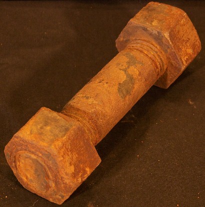 This bolt & nuts is larger than it seems, measuring almost a foot long and weighing in at nearly 10 pounds. A curiousity became evident while recovering relics- it seems as bolts & nuts were removed they were often placed back together, then discarded or dropped by accident. Why bother to put them back together? Only the bridge workers knew.