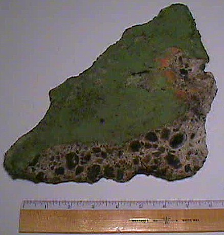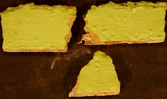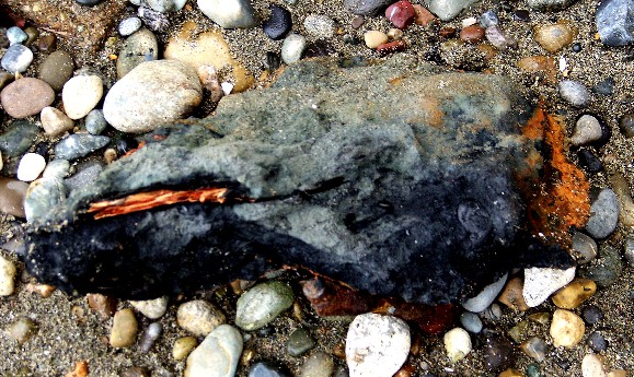 These are pieces of painted concrete that have fallen off the underside of the 1950 bridge's roadway. Everything gets old, and the existing bridge is no exception. Small chunks like these fall off quite often, but not enough to be cause for concern; unless a person was unfortunate enough to be walking the beach under the bridge when one fell on them. The 1950 bridge was painted in the same Narrows Green color as the 1940 bridge. This color was chosen to blend into & compliment the natural green hillsides of Tacoma & Gig Harbor.