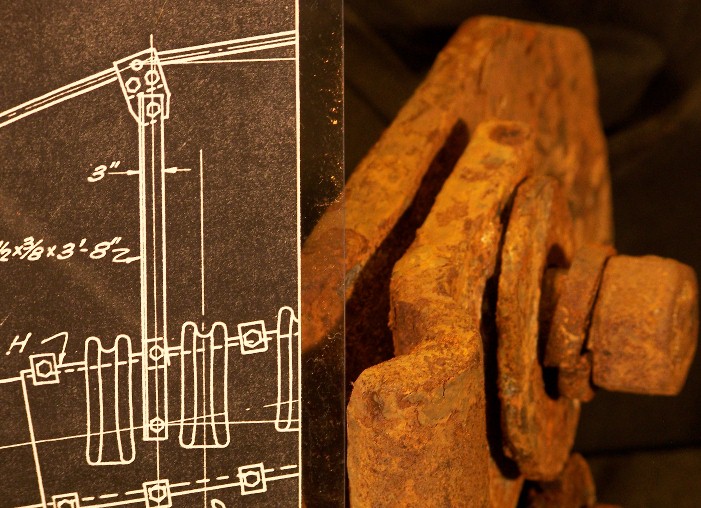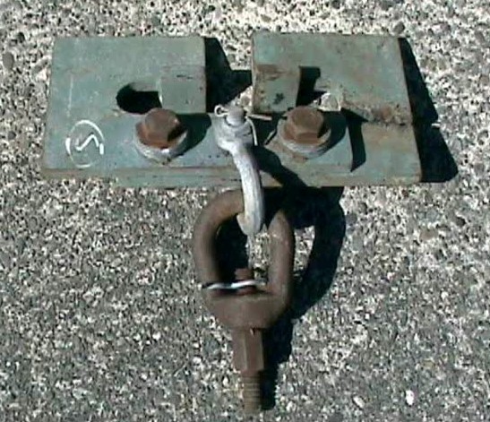 Shown below is not a part of the bridge, but a tool used to assemble the parts. It is known as a Delta plate, and was used at the end of cranes to secure large loads such as the girder seen in the B & W photo by Jack Durkee. A rare find, perhaps it had gotten stressed beyond acceptable limits and discarded? Or, maybe it fell off the crane hook & it wasn't worth the effort to get it back.