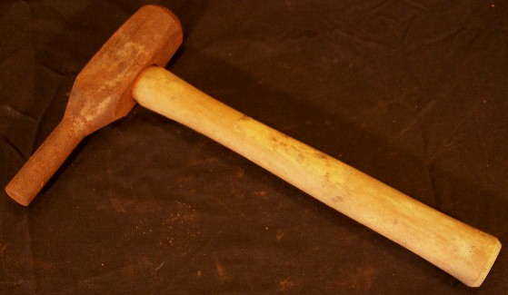 Shown below are a couple of tools- the first is a mechanical jack. The gear on the right end rotates and either pushes the jack shaft out or lets it in, depending on which direction it is turned, which was probably done on a machine that had a corresponding gear. The other tool is a rivet set or driver, which was placed on the end of the compression equipment, and the round socket placed over the rivet to forcefully, or drive it securely in place. The photo on the below right is a modern example of the same type of rivet set.