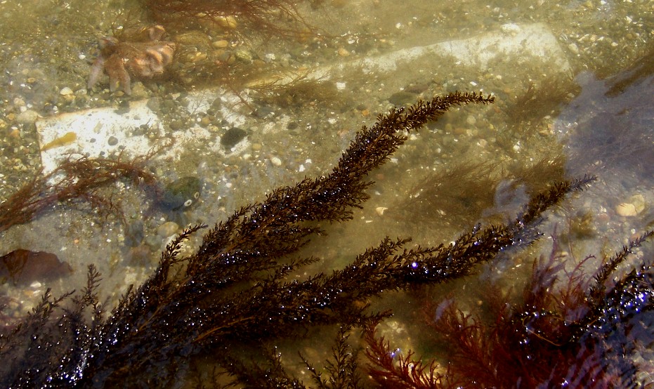 Below is the large plate meant for installation on the 2007 bridge, and mentioned above. It is so heavy that it could not be recovered from the water, and this was found at an extremely low tide. In a normal tide it is quite a ways out & underwater- perhaps a relic for the future? A close look at the upper left of the photo reveals what looks like a baby octopus in the water, but it is really just a starfish. This area does have a population of Giant Pacific Octopus that can get quite large as the name implies. An adult octopus' tentacles can reach up to 16 feet in length.