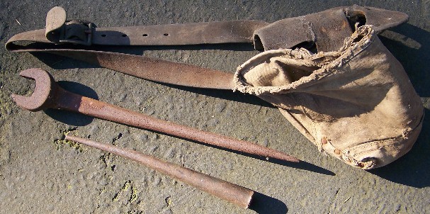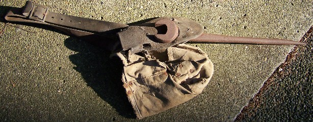 Shown in the next four photos are some of Earl R. White's tools which he used during the 1950 bridge construction. The picture below is of his worn tool bag, with his spud wrench. Spud wrenches have two ends, and each has a different purpose. Imagine the huge iron sections hanging on the end of a Chicago boom (a large crane), and as each is lowered into place to create the framework of the bridge, the pointed end of a spud wrench is inserted into the iron's rivet holes to align the section that is being placed. The other end of this tool is a wrench which is used to fasten bolts between two or more sections to temporarily secure them together.
