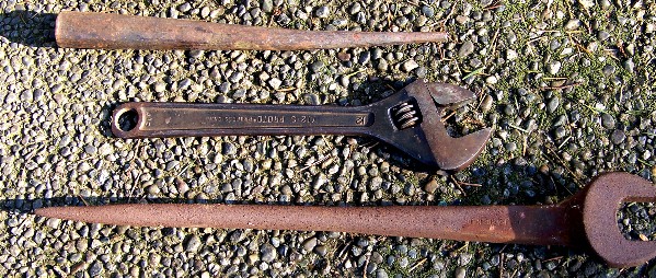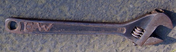 Earl's crescent wrench seen here was modified by him in a number of ways. He notched out the adjustment wheel to allow for larger size nuts & bolts. He also shaved the handle end flat to be used as a smaller version of a sleaver bar end. And he marked his initials "E. W." onto the handle end, as seen on the left.