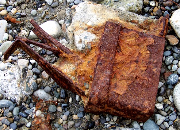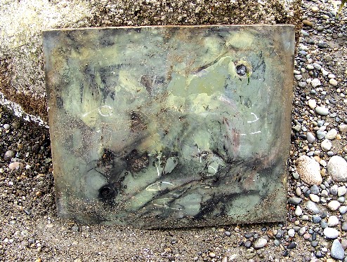 UPDATE: The large plate that is shown in the water above, was recovered from the water during a low tide in 2008, and photographed below. This was no easy feat, as the plate is about 2 feet by 3 feet, and is triple thick. In other words- it is 3 plates bonded together to make one heavy-duty plate, and it weighs nearly 200 pounds!