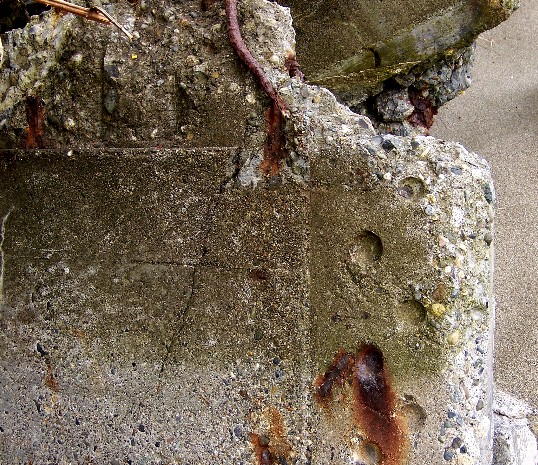 The photo below reveals an interesting look at a chunk of Gertie's remains. This is a section of the concrete deck, looking at it from below. Notice the pattern of indentations on the right. This was from the riveted framing that the concrete was poured across. The opposite side of this concrete is Gertie's sidewalk and curb.