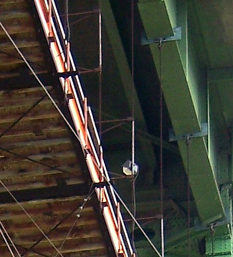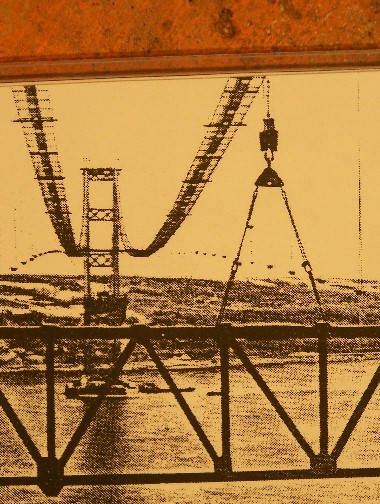 A look at the completed bridge and cables, with the band relic from the above photos seen on the near side main cable, last band just above the top of the girder.