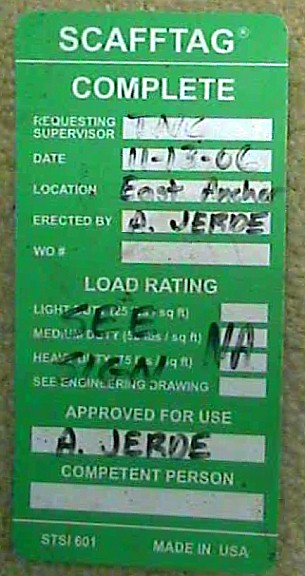 A recent search turned up this Inspection tag, dated in November of 2006. Of note, and actually kind of funny is the fact that the bottom space to be filled out, yet it was left blank; is where the person in charge of being "Competent" was suppose to sign.