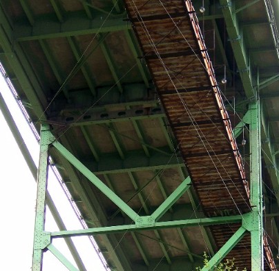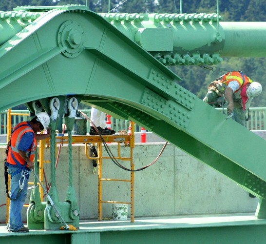 Seen below are bridge painters working diligently to get their job done in time. Although the man on the right is using a spray gun, much of the paint job required hand-applications, so as to not waste paint into the air, and to get the round surfaces properly covered. This photo is courtesy of a photographer of many bridges in the United States; Patrick S. O'Donnell.