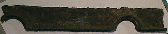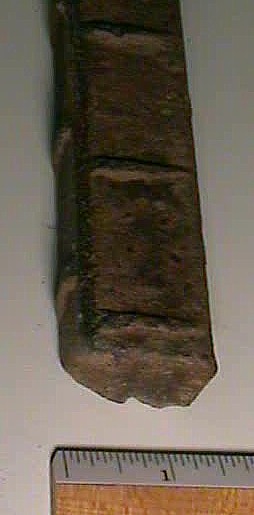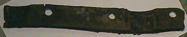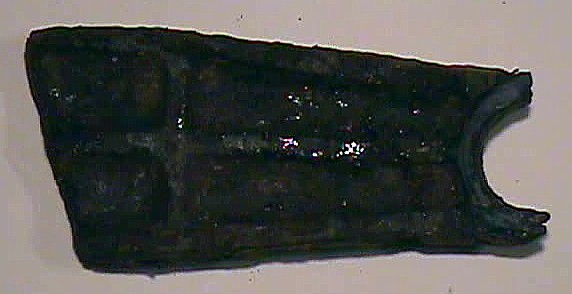 This second photo shows a slightly different conglomerate build-up. It is a thin piece of sheet metal that was found in a layer of clay. The clay has formed around the metal, trapping the metal's corrosion, which turns black; inside the clay. Most of the relics shown below had similar build-up on them, which required a lot of effort to remove the conglomerate & clean them, even to the degree as seen in the relics below. The metal deterioration you see happened over the decades, and in some cases it is a wonder there is any metal left; which did nearly completely destroy some of the relics not seen here, as they crumbled upon discovery.