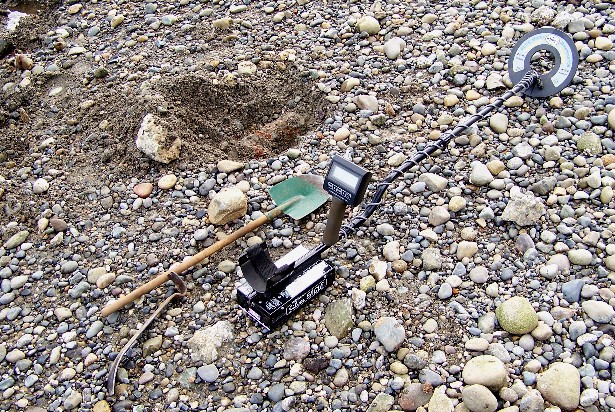 Using a quality Whites metal detector makes a big difference in the hunt for buried treasures, especially under the Tacoma Narrows bridges where unwanted readings for concrete with rebar are plentiful. The other tools of the trade needed are a good shovel & a prybar. The shovel gets to the find, and the prybar gets it out of the clay.