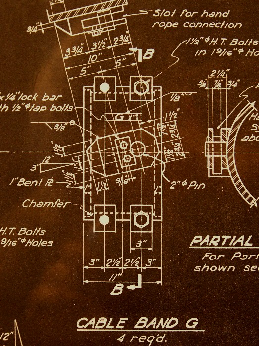 The photos above and below are of a hand rope retainer as seen in the 1939 blueprint. There were a pair of wires, called hand "ropes" in the plans, on each of the main suspension cables crossing the bridges that workers held onto while climbing up to the towers. This is one of the many brackets that fastened the hand rope to a rigid bar, which in turn was connected to a cable band.