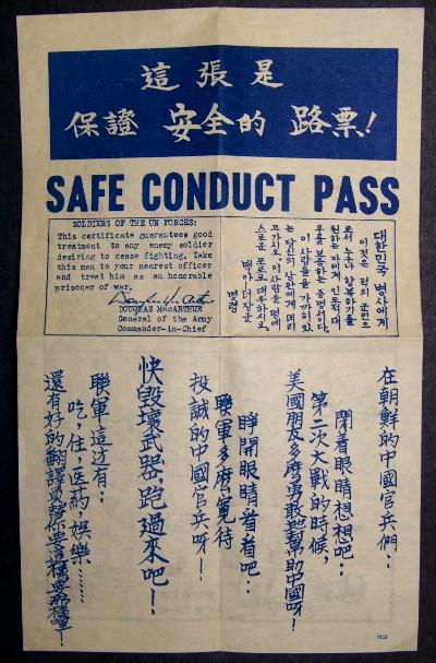 ITEM 952: Korean War Safe Conduct Pass. Near mint condition, and a rare item with a printed signature of Douglas MacArthur.