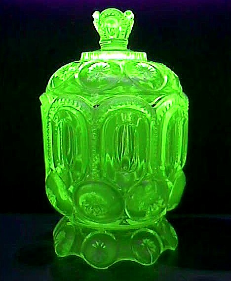 ITEM 650: Vaseline glass compote w/lid. Excellent condition. Four-part mold, beautiful item!